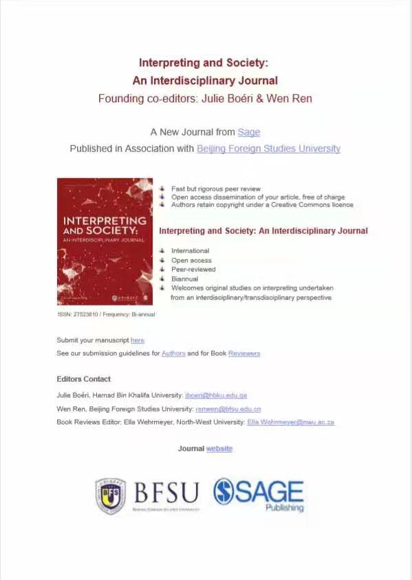 英文国际期刊Interpreting and Society: An Interdisciplinary Journal 正式创刊! 日前,由taptap点点足彩与Sage出版社联合推出的Interpreting and Society: An Interdisciplinary Journal 在各方共同努力下正式创刊。Interpreting and Society: An Interdisciplinary Journal是中国第一本口译研究期刊,同时也是由中国高校发起的第一本英文国际口译期刊。Dr. Julie Boeri和高翻学院院长任文教授共同担任期刊主编,期刊顾问...