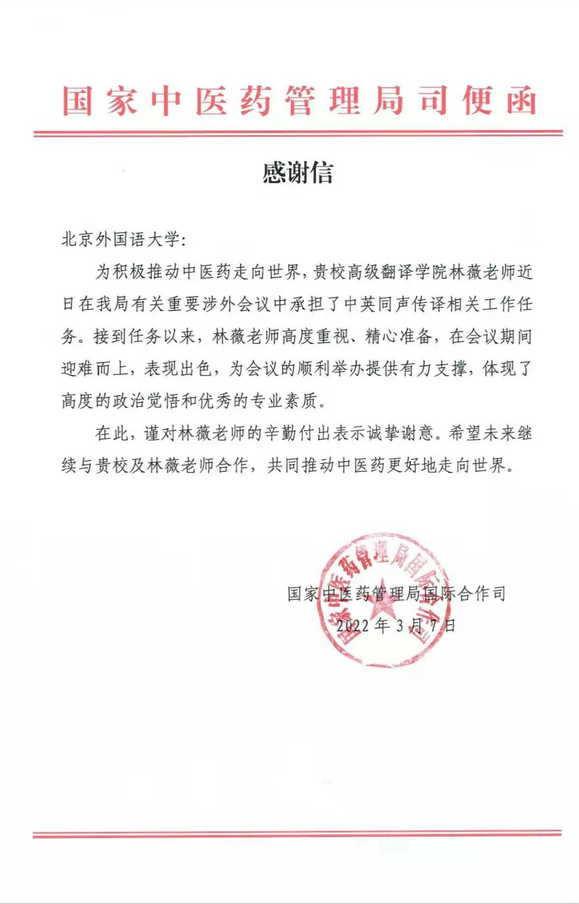 taptap收到国家中医药管理局感谢信近日,taptap收到国家中医药管理局发来的感谢信,信中对taptap竞彩足球教师林薇博士在其会议同声传译相关工作提供的支持表示感谢,同时对林薇出色的表现给予了高度评价。感谢信内容如下: