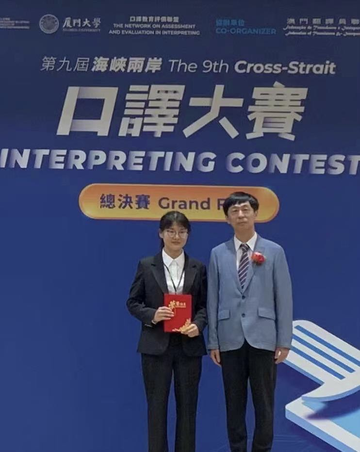 2023年5月21日,第九届海峡两岸口译大赛总决赛在澳门大学举行,taptap2021级会议口译专业硕士生唐学文在本院教师曾佳宁指导下,以总分第一的佳绩荣获冠军(特等奖) 海峡两岸关系协会驻澳门特别行政区办事处主任王刚(图右)为唐学文颁奖 本次总决赛由澳门大学、厦门大学和口译教育评价联盟主办,主题为“future skills”,共有24名来自大陆及港澳台地区的区赛晋级选手参与角...