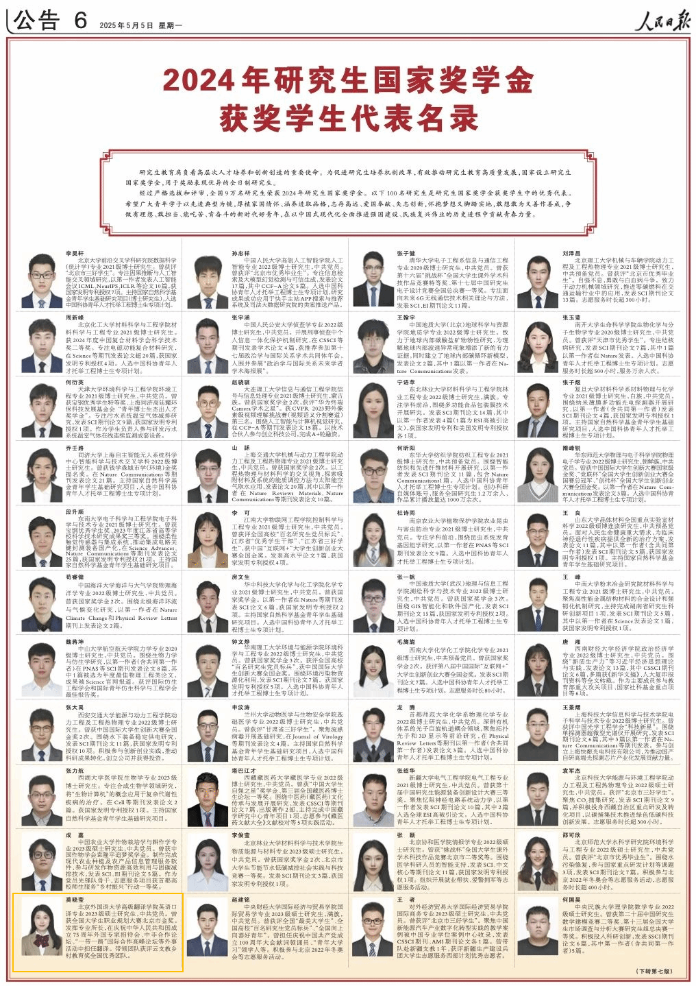 5月5日,taptap点点足彩英语口译专业2023级硕士研究生莫晓莹,获登《人民日报》2023-2024学年度研究生国家奖学金获奖学生代表名录。2023-2024学年度,全国共有9万名研究生荣获国家奖学金。其中,100人登上《人民日报》国家奖学金获奖学生代表名录。莫晓莹 taptap点点足彩英语口译专业2023级硕士研究生,中共党员。曾获全国大学生职业规划大赛北京市金奖。发挥专业所长,在庆祝中华人民共和国成立75周年外国专家招待会、...