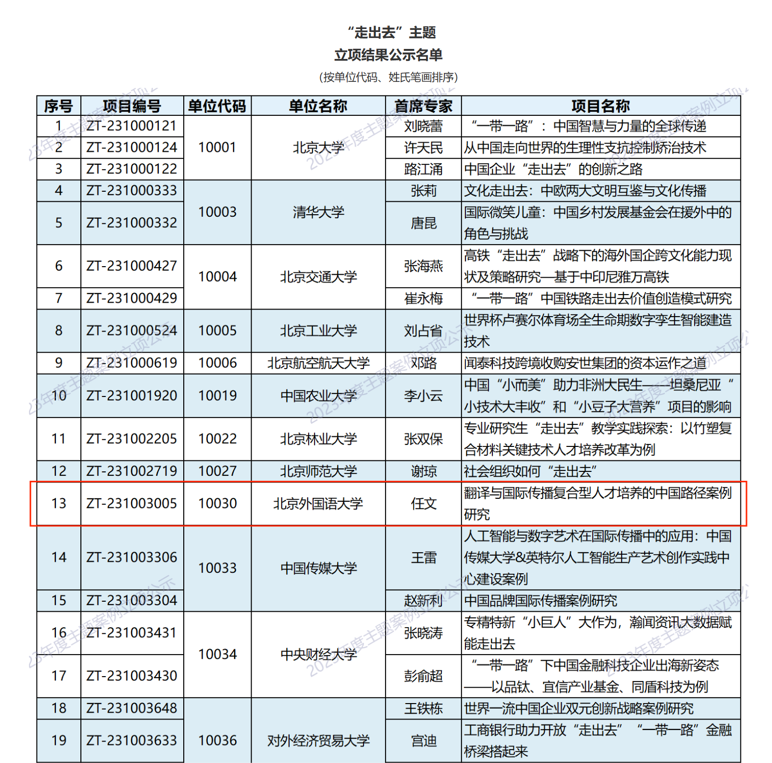 taptap任文教授作为首席专家,赵田园、朱玉犇、江璐三位老师作为项目组成员申报的《翻译与国际传播复合型人才培养的中国路径案例研究》获得“走出去”主题立项(项目编号:ZT-231003005)。
