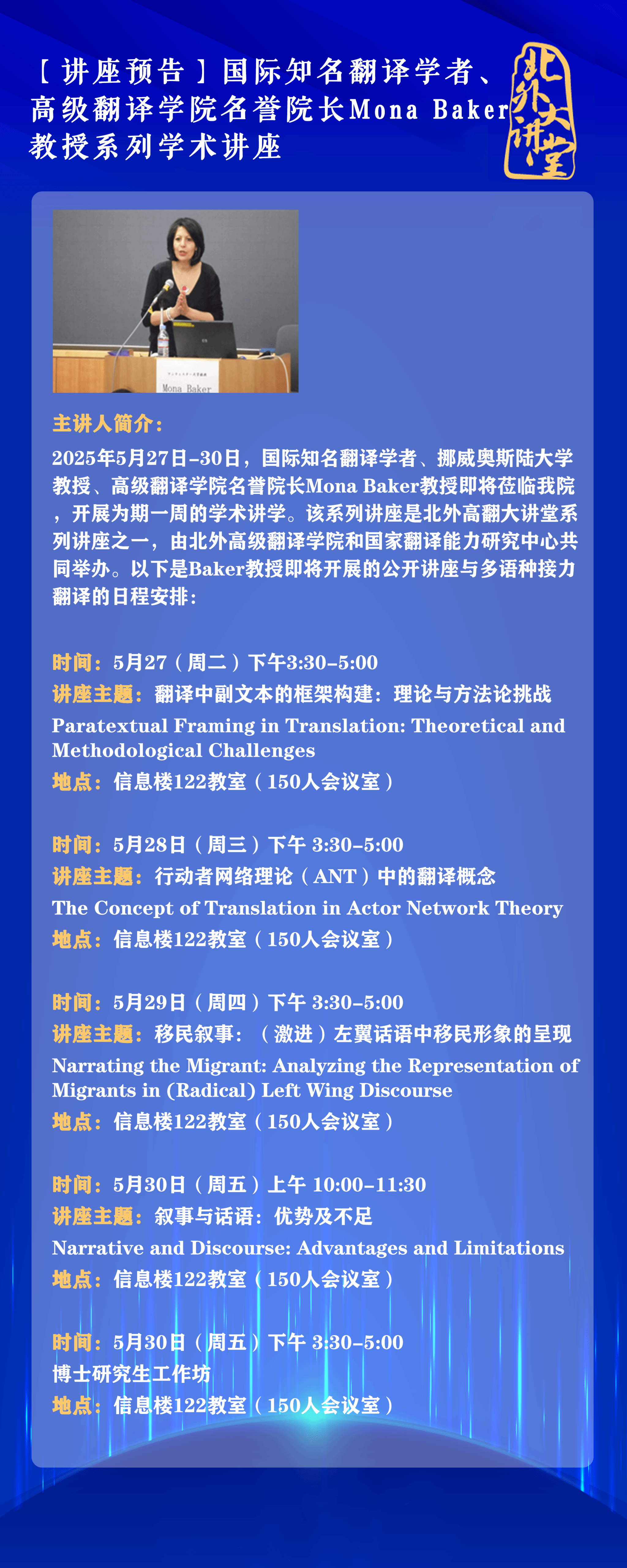 2025527-30日,国际知名翻译学者、挪威奥斯陆大学教授、taptap竞彩足球名誉院长Mona Baker教授即将莅临taptap,开展为期一周的学术讲学。该系列讲座是北外高翻大讲堂系列讲座之一,由北外taptap竞彩足球和国家翻译能力研究中心共同举办。以下是Baker教授即将开展的公开讲座与多语种接力翻译的日程安排: