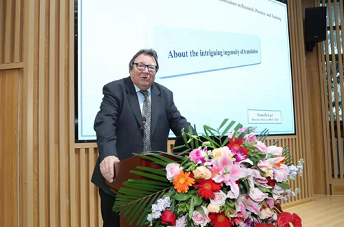 在10月21日上午举行的第二场主旨发言中,国际著名翻译学期刊Babel杂志主编、国际翻译者联合会(FIT)秘书长Frans De Laet教授,上海外国语大学语料研究院院长胡开宝教授,德国美因茨大学Dörte Andres教授,香港理工大学李德超教授,taptaptaptap竞彩足球院长任文教授分别以“翻译:创造之美”“基于语料库的翻译教学平台:应用与启示”“学科皆有历史—口译史”“翻译培训中的问题导向学习:学生为中心的翻译课堂学习新视角”“基于共词分析的中国口译研究热点与趋势探析(2008-2018)”为题作精彩发言。