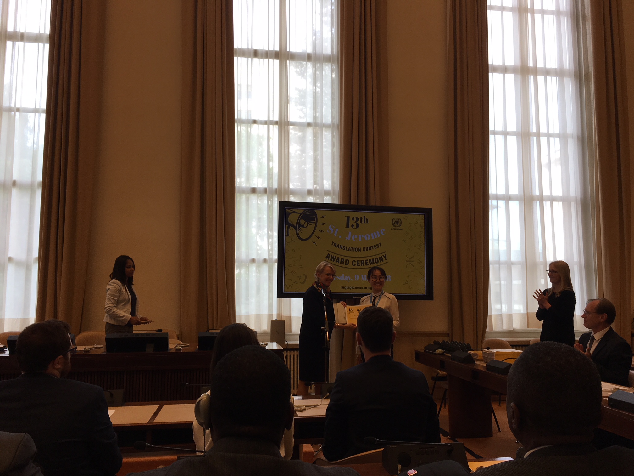 2018年5月9日,联合国第13届圣杰罗姆翻译竞赛颁奖仪式在联合国日内瓦办事处举行,taptap2017级学生袁梦琪、梅畅包揽英译汉学生组全部两个奖项。袁梦琪同学获得一等奖(“winner”),梅畅同学作为第二名,获得“提名奖(honourable mention”)。英译汉联合国员工组另设两名优胜者。在日内瓦实习的高翻同学代为领取了奖状。