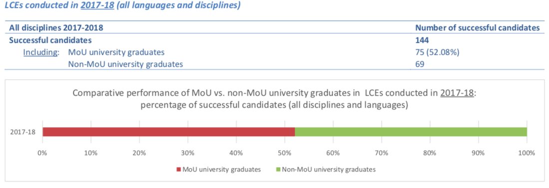 2017和2018年各语种通过LCE的人员中来自合作院校者所占比例(红色)