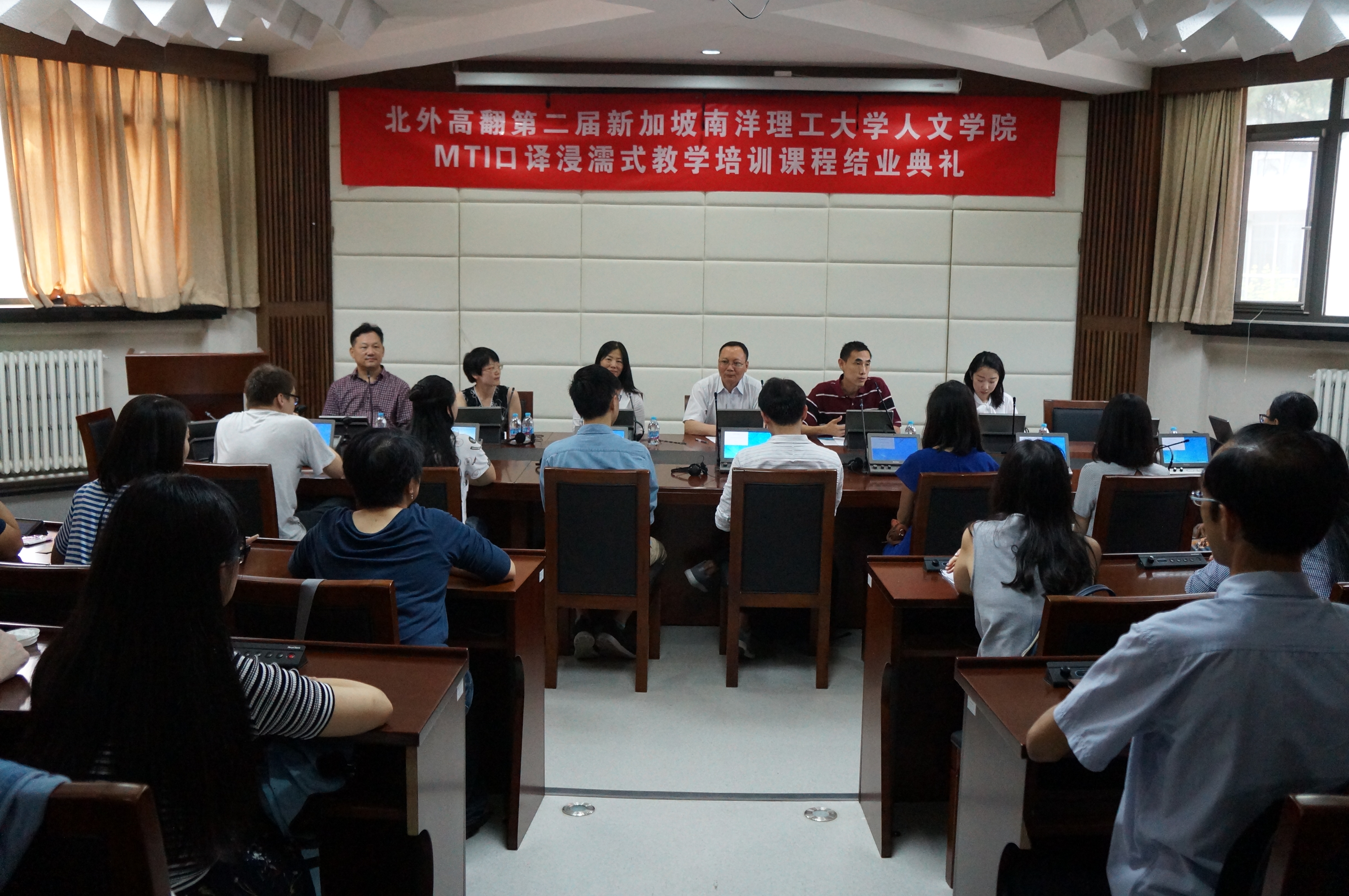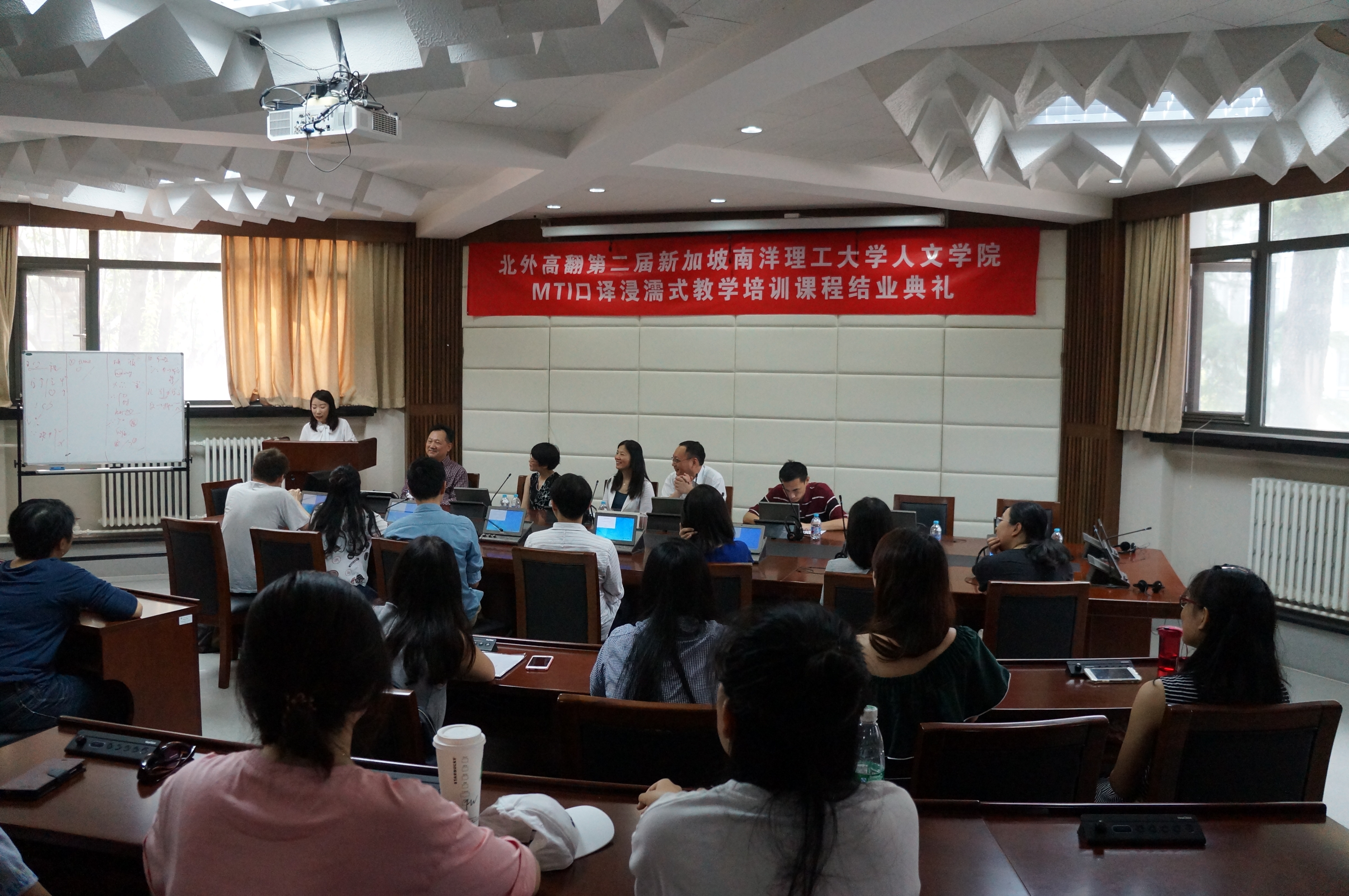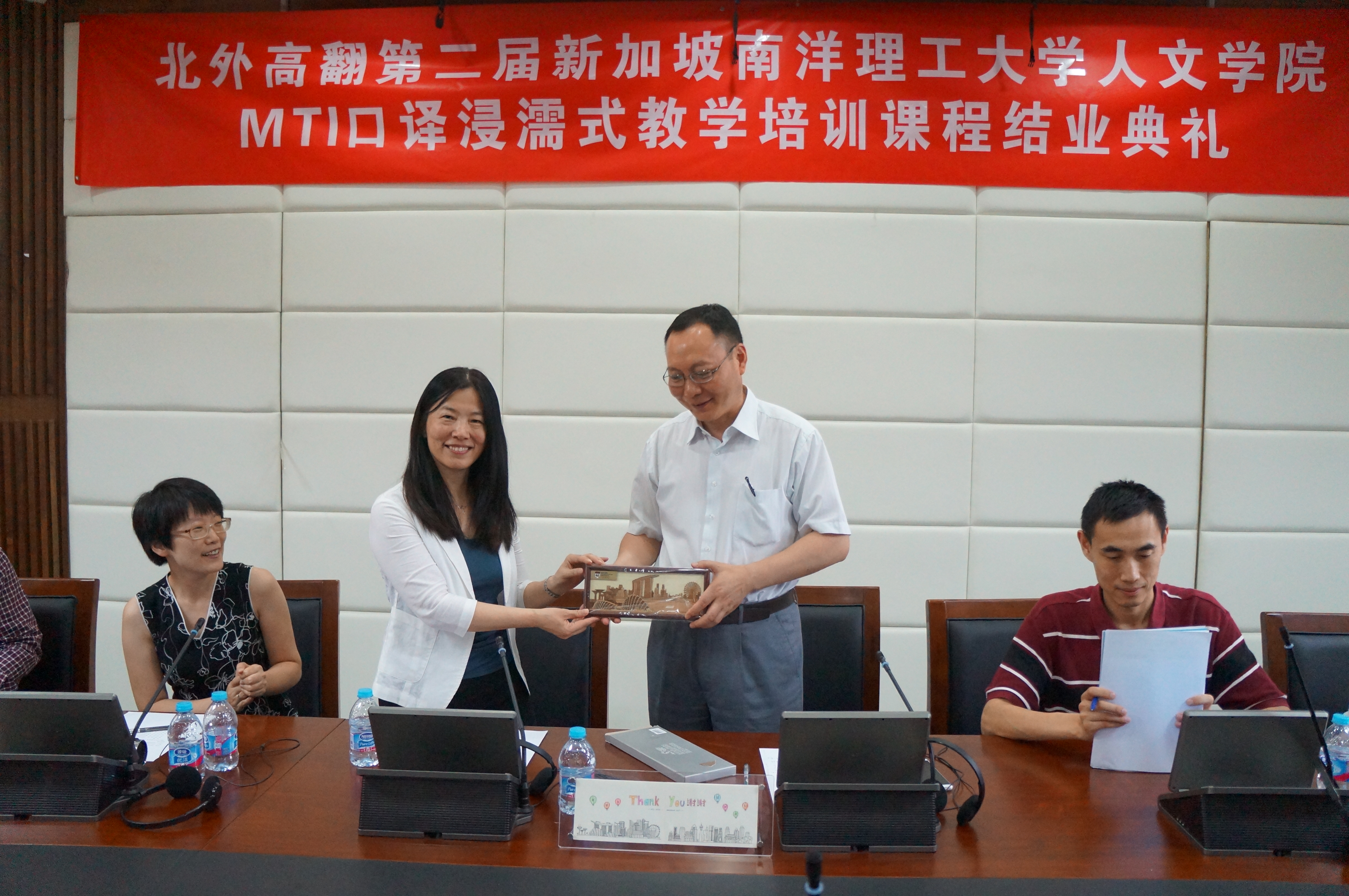 结业典礼上,学员以现场交替传译的方式,展示了六周学习后的学习成果,令人赞叹不已。教师代表也对整个培训期间的教学过程进行了总结。taptap竞彩足球副院长李长栓教授和新加坡南洋理工大学人文学院的高虹老师也分别代表培训方和受训方发表了培训感言。
